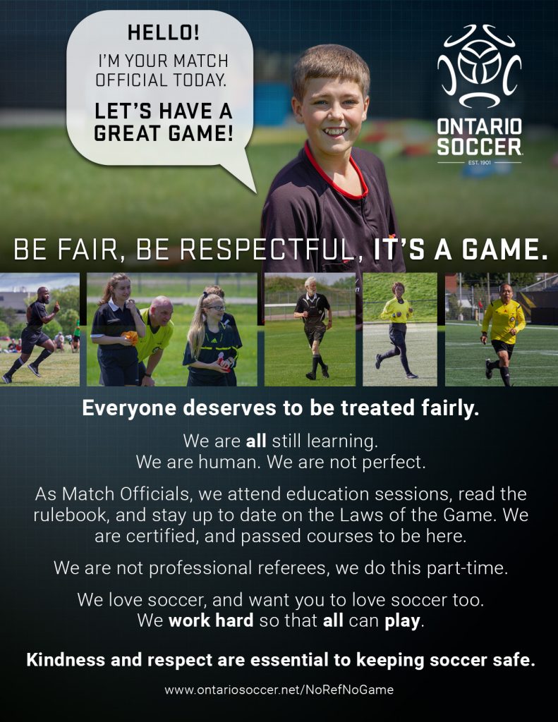 Ontario Soccer is proud to pave the way for a cultural change in treatment of Match Officials through the No Ref, No Game program.